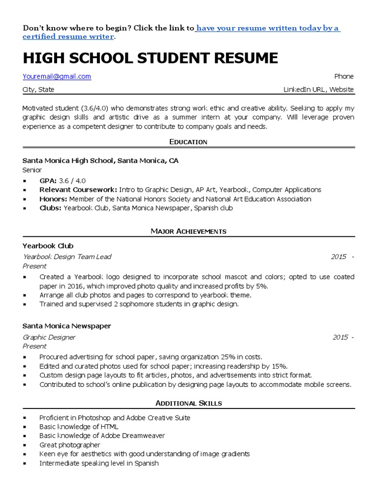 CVs for school leavers and high school student CVs can be challenging due to the lack of professional work experience but there are several ways to make writing a high school CV much easier. Students have much more experience than they often think at first thanks to projects they've... High school resumes give colleges a snapshot of your accomplishments and interests. Learn how to craft a standout college resume for your applications. High school student resumes give colleges a snapshot of your accomplishments, extracurriculars, hobbies, and work history. They can also be a... High School Resume Templates by Canva. Despite