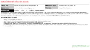 Not every Senior Computer Operator resume includes a professional summary, but that's generally because this section is overlooked by resume writers. If you have the space to include it, you should. Especially considering you have such a short time to impress anyways. Another Computer Operator resume template; Karen Brown Dayjob Limited The Big Peg 120 Vyse Street Birmingham B18 6NF England T: 0044 121 638 0026 E: info@dayjob.com. PERSONAL SUMMARY. A technically minded professional who has extensive experience of operating multipurpose, multi-tasking computer systems. There are plenty of opportunities to land a Computer Operator job position, but it won't just