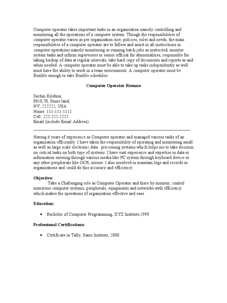 computer operator resume doc